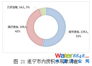 出現(xiàn)較大降雨時(shí),遂寧市內(nèi)澇積水現(xiàn)象的調(diào)查中,53%的受訪者選擇經(jīng)常發(fā)生42%的受訪者選擇偶爾發(fā)生,僅有5%的受訪者選擇幾乎沒有