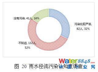 在問及您覺得城市雨水徑流有污染嗎時(shí),32%的受訪者認(rèn)為污染比較嚴(yán)重52%的人不知道,另有16%的人認(rèn)為沒有污染