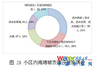 您認(rèn)為最適合在小區(qū)內(nèi)使用的海綿城市建設(shè)措施問題中,31%的人選擇了透水路面(透水磚、透水瀝青、透水混凝土等)、26%的人選擇了下沉式綠地(路邊綠地低于路面5-10公分)16%的人認(rèn)為是水景,另有14%13%的人認(rèn)為是雨水收集捅綠色屋頂(在屋頂種植花草)。