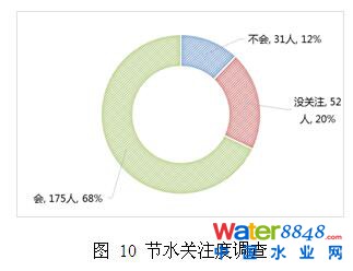 您能夠接受的節(jié)水措施的調(diào)查中, 34%的人可以接受實(shí)施階梯式水價(jià)制度、多用水多交錢,29%的人接受使用節(jié)水型生活用水器具(節(jié)水馬桶、節(jié)水龍頭等),37%的人則選擇雨水用于小區(qū)綠化、水景、洗車等雜用水