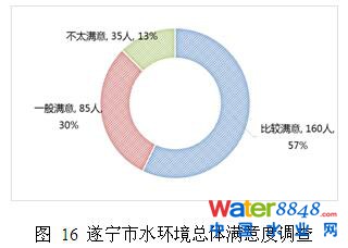 您對遂寧市河湖水系水環(huán)境總體情況是否滿意的問題中,57%的人比較滿意、30%的人一般滿意13%的人不太滿意。