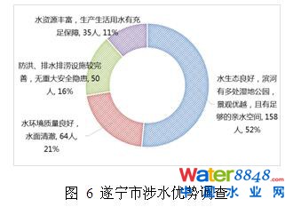 遂寧市在涉水方面最大的優(yōu)勢的問題中,51%的受訪者選擇了水生態(tài)良好,濱河有多處濕地公園,景觀優(yōu)越,且有足夠的親水空間、21%的受訪者認(rèn)為是水環(huán)境質(zhì)量良好,水面清澈、16%的受訪者選擇防洪、排水排澇設(shè)施較完善,無重大安全隱患,另有11%的人認(rèn)為水資源豐富,生產(chǎn)生活用水有充足保障是最大優(yōu)勢。