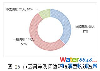 在問及您對市區(qū)河岸及周邊環(huán)境是否滿意時(shí),37%的人認(rèn)為比較滿意、53%的人認(rèn)為一般滿意,僅有10%的人選擇不太滿意。