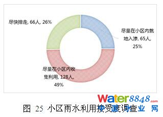 小區(qū)內(nèi)的雨水快排/利用問題中,25%的受訪者支持盡量在小區(qū)內(nèi)就地入滲、49%的人支持盡量在小區(qū)內(nèi)收集利用、25%的人則認(rèn)為應(yīng)盡快排走。