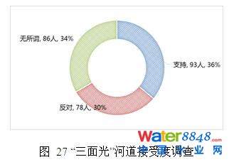 對河道堤岸采取水泥硬化(三面光)的看法中,36%的受訪者支持、30%的受訪者反對、33%的人則認(rèn)為無所謂。