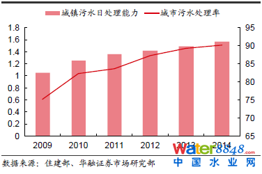 此次修訂稿的發(fā)布,也正式拉開了污水處理廠提標改造的序幕。近年來,我國城鎮(zhèn)污水處理率不斷提升,截至2014 年底,城市污水處理率達到90.18%,污水處理廠集中處理率為85.94%。排放標準的大幅提高預(yù)計將開啟污水廠的升級改造, 有望在2016-2017 年釋放大量需求。