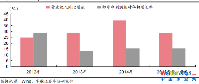 公司是利用膜技術(shù)為客戶提供給水、污水處理及再生水回用的整體解決方案的提供商,具有水處理全產(chǎn)業(yè)鏈。公司主營業(yè)務(wù)包括污水處理整體解決方案、市政與給排水工程、凈水器。截至2015 年三季度,公司實現(xiàn)營業(yè)收入17.0 億元,同比增長31.56%。實現(xiàn)歸母凈利潤2.53 億元,同比增長51.47%,業(yè)績實現(xiàn)高速增長。