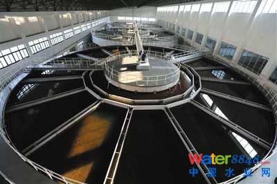 昨日,北京郭公莊水廠機(jī)械加速澄清池內(nèi)正在過濾“南水”。楊益 攝