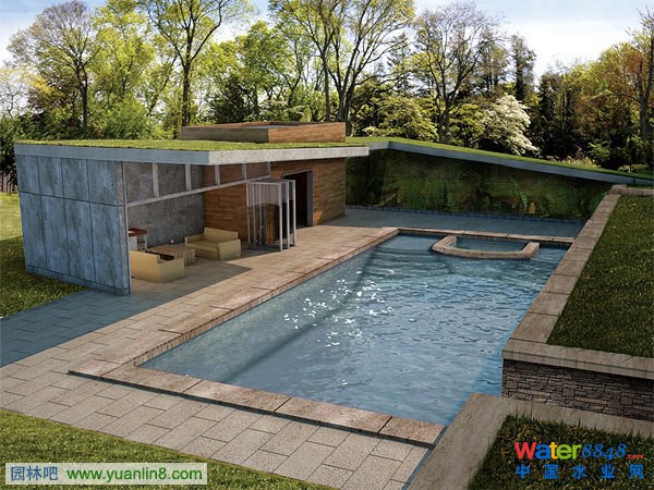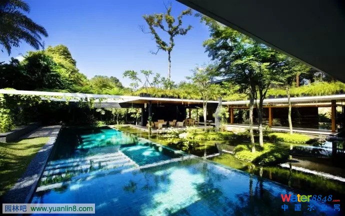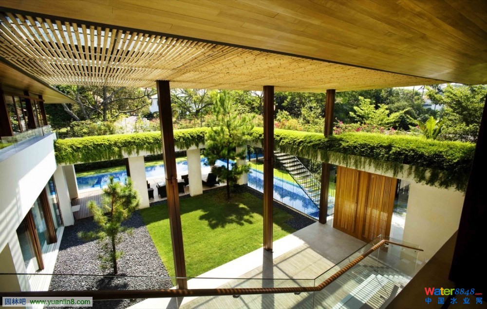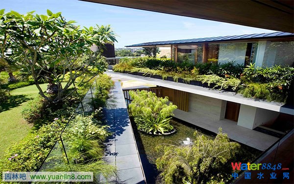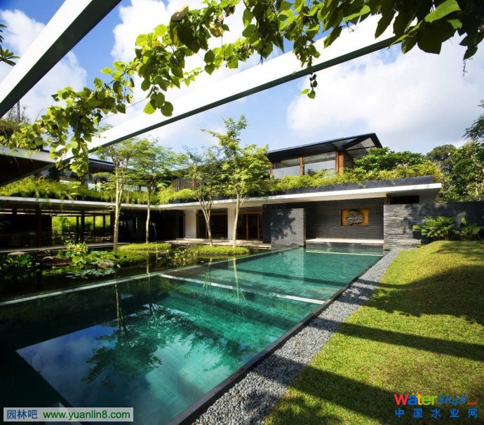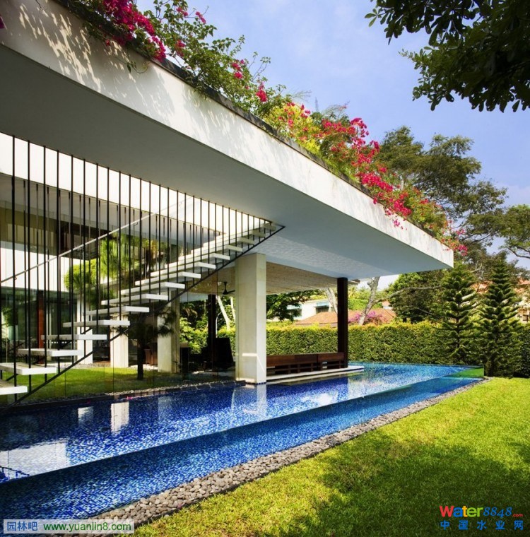 最好的景觀設計永遠不能沒有池塘或水的設計, GUZ Architects設計這套建在經(jīng)過園藝美化的場地上的重疊式結構的豪宅,波光麟麟的水池的庭院,屋頂上“溢出”到花園中的植物,心醉。