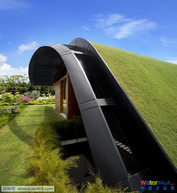 這個相互交叉的屋頂結構,看起來很不同,整個房子從地面開始一個美麗的綠色環(huán)境。