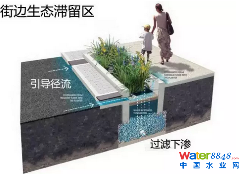 ►和雨水花園具有相同功能的措施還有生態(tài)滯留區(qū)。但較前者不同的是,生態(tài)滯留區(qū)土壤對(duì)于工程技術(shù)要求相當(dāng)嚴(yán)格,對(duì)于土壤和工程排水結(jié)構(gòu)也都有明確的要求,并且根據(jù)位置的不同可分為生態(tài)滯留帶、生態(tài)樹池、生態(tài)滯留池等。如同下圖街邊生態(tài)滯留區(qū),通過對(duì)街豁口將路面徑流引流至收水區(qū)進(jìn)行蓄留。