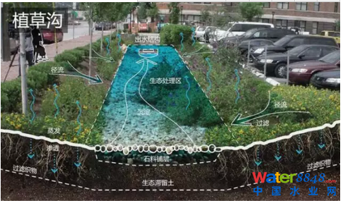 ►假設(shè)比起調(diào)蓄下滲徑流,更需要收集、輸送和排放徑流的話,則可以設(shè)置植草溝。植草溝為橫切面呈三角形或梯形的帶狀下凹綠地,適用于道路兩旁綠化隔離帶等狹長地帶。由于水流速度相對(duì)較快,在植草溝內(nèi)應(yīng)以石頭鋪于底部防止土壤侵蝕。