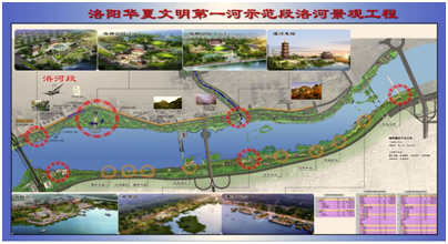項(xiàng)目基本情況:2014年8月,洛陽市政府確定啟動(dòng)新一輪洛河市區(qū)段32公里水系綜合治理和改造提升工程,旨在全面提升洛河兩岸的景觀環(huán)境,打造“華夏文明第一河”的全新理念。前期啟動(dòng)的示范區(qū)包括洛陽橋至李樓橋洛河5.5公里段,瀍河至上游5.2公里段,內(nèi)容涉及多個(gè)節(jié)點(diǎn)及景觀核心區(qū)域。