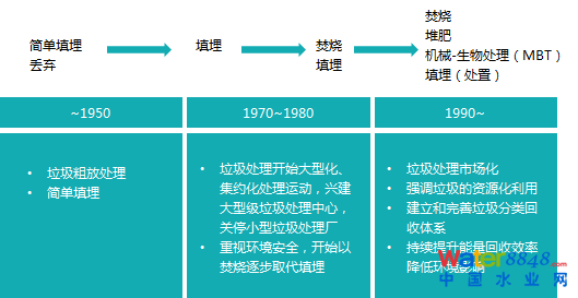 概括而言,在治理思路上,發(fā)達(dá)國(guó)家所走過的路有這樣幾個(gè)大的趨勢(shì):逐步取代/淘汰填埋;集中化、大型化處理;提高資源化利用率;市場(chǎng)化(第三方處理)等。