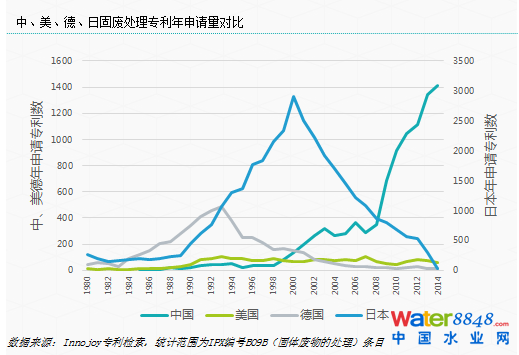 2008年后,由于社會(huì)對(duì)環(huán)保問題的關(guān)注和基礎(chǔ)設(shè)施投資建設(shè)潮的到來,我國(guó)固廢處理行業(yè)邁入一個(gè)新的階段(值得一提的是,在環(huán)保產(chǎn)業(yè)的諸多領(lǐng)域,2008都是較為特殊的一年,許多指標(biāo)都有突出的增長(zhǎng),這與奧運(yùn)帶來的環(huán)保話題效應(yīng)以及隨之而來的治污舉措不無關(guān)系)。工業(yè)危廢、電子廢棄物、餐廚垃圾等更加專業(yè)化和細(xì)分化的市場(chǎng)領(lǐng)域開始啟動(dòng),快速增長(zhǎng)的市場(chǎng)容量催生出了東江環(huán)保等技術(shù)色彩更濃的上市公司。固廢處理領(lǐng)域的技術(shù)創(chuàng)新迎來了第二次爆發(fā)。目前,我國(guó)的年專利申請(qǐng)量已超過美、德、日等一眾發(fā)達(dá)國(guó)家,全球固廢領(lǐng)域技術(shù)創(chuàng)新最為活躍的國(guó)家。目前中國(guó)每年新申請(qǐng)的固廢處理相關(guān)專利在1500個(gè)左右,這一數(shù)字依然在不斷增長(zhǎng)。