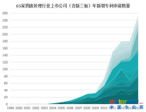 但另一方面,從固廢處理企業(yè)的研發(fā)投入及專利申請(qǐng)?jiān)鲩L(zhǎng)量情況來看,企業(yè)主體正在向扛起技術(shù)創(chuàng)新大旗的目標(biāo)努力。下圖是對(duì)包括新三板企業(yè)在內(nèi)的65家固廢處理上市公司年專利申請(qǐng)量的統(tǒng)計(jì),可以發(fā)現(xiàn),企業(yè)的年專利申請(qǐng)量呈現(xiàn)跨越式增長(zhǎng)。可以說,市場(chǎng)化的企業(yè)主體在固廢處理領(lǐng)域的技術(shù)創(chuàng)新方面擁有愈加重要的地位。
