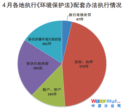 環(huán)境保護(hù)部環(huán)境監(jiān)察局局長田為勇介紹說,4月全國范圍內(nèi)實(shí)施按日連續(xù)處罰案件共47件,罰款數(shù)額達(dá)4107.37萬元;實(shí)施查封、扣押案件共573件;實(shí)施限產(chǎn)、停產(chǎn)案件共165件;移送行政拘留共282起;移送涉嫌環(huán)境污染犯罪案件共201件。