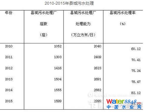 2015年年末,全國縣城共有污水處理廠1599座,比上年增加44座,污水廠日處理能力2999萬立方米,比上年增長4.1%,排水管道長度16.8萬公里,比上年增長4.8%?h城全年污水處理總量78.9億立方米,污水處理率85.22%,比上年增加3.10個百分點,其中污水處理廠集中處理率83.46%,比上年增加3.27個百分點。