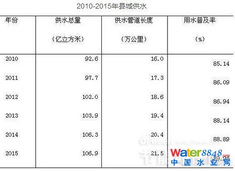2015年年末,縣城供水綜合生產(chǎn)能力達到0.58億立方米/日,比上年增長6.1%,其中,公共供水能力0.48億立方米/日,比上年增長4.3%。供水管道長度21.5萬公里,比上年增長5.5%。2015年,全年供水總量106.9億立方米,其中生產(chǎn)運營用水27.2億立方米,公共服務(wù)用水11.7億立方米,居民家庭用水49.1億立方米。用水人口1.40億人,用水普及率89.96%,比上年增加1.07個百分點,人均日生活用水量119.43升。2015年,縣城節(jié)約用水3.2億立方米,節(jié)水措施總投資3.8億元。