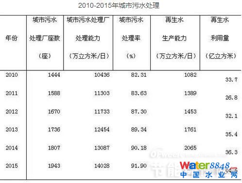 2015年年末,全國城市共有污水處理廠1943座,比上年增加136座,污水廠日處理能力14028萬立方米,比上年增長7.2%,排水管道長度54.0萬公里,比上年增長5.6%。城市年污水處理總量428.8億立方米,城市污水處理率91.90%,比上年增加1.72個百分點,其中污水處理廠集中處理率87.97%,比上年增加2.03個百分點。城市再生水日生產(chǎn)能力2317萬立方米,再生水利用量44.5億立方米。