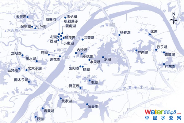 圖為武漢市內(nèi)湖區(qū)分布圖
