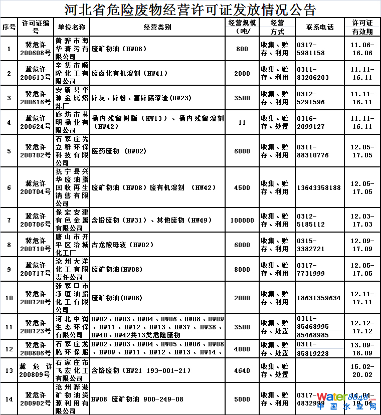 河北省環(huán)保廳發(fā)不了河北省獲得危廢處置資質(zhì)名單,詳情如下: