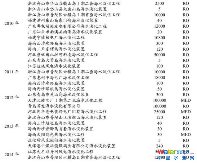 海水淡化工程主要集中在水價(jià)較高的沿海省份。已建成的海水淡化工程主要集中在水資源短缺的沿海9。禾旖颍31.73萬(wàn)噸/日)、山東(16.07萬(wàn)噸/日)、河北(16.87萬(wàn)噸/日)、遼寧(6.82萬(wàn)噸/日)、浙江(20.18萬(wàn)噸/日)、廣東(8.17萬(wàn)噸/日)、福建(1.17萬(wàn)噸/日)、江蘇(0.51噸/日)、海南(1.14萬(wàn)噸/日)。其中,北方以大規(guī)模的工業(yè)用海水淡化工程為主,主要集中在天津、河北、山東等地的電力、鋼鐵等高耗水行業(yè);南方以民用海島海水淡化工程居多,主要分布在浙江、福建、海南等地,以百?lài)嵓?jí)和千噸級(jí)工程為主。