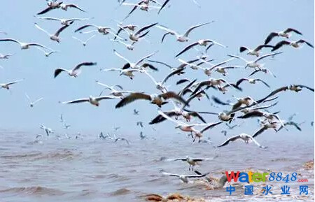 一群海鷗飛舞在山東省無棣縣大口河自然保護區(qū)渤海岸邊(朱崢2015年5月21日攝)