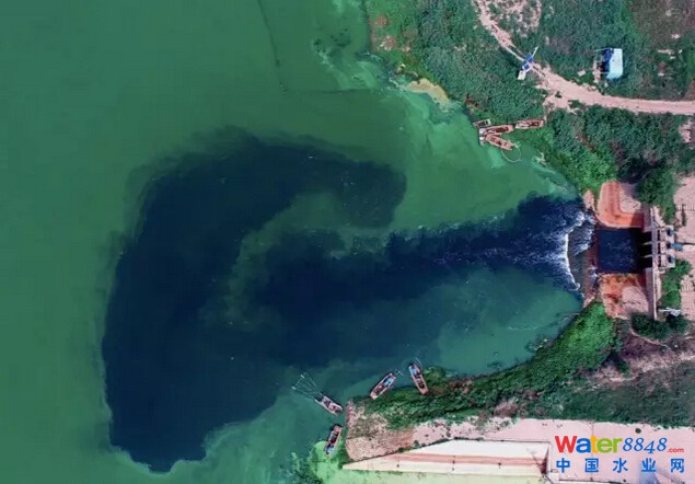 排入渤海的天津獨流減河上游的寬河泵站正在排放污水(岳月偉7月6日攝)