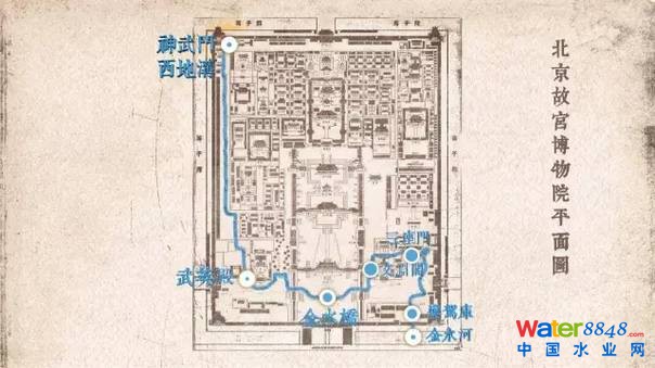 除了地勢(shì)選擇上的優(yōu)勢(shì),流經(jīng)大半個(gè)紫禁城的內(nèi)金水河,無(wú)疑是整個(gè)排水系統(tǒng)的主角。內(nèi)金水河所引為西郊玉泉山水,因西在五行中屬金,“金生麗水”,故名金水河,全長(zhǎng)2000多米,由神武門(mén)西地溝引護(hù)城河水流入宮內(nèi),沿西一帶經(jīng)武英殿前,至太和門(mén)前金水橋下,復(fù)流經(jīng)文淵閣前至三座門(mén),從鑾駕庫(kù)東南出紫禁城。