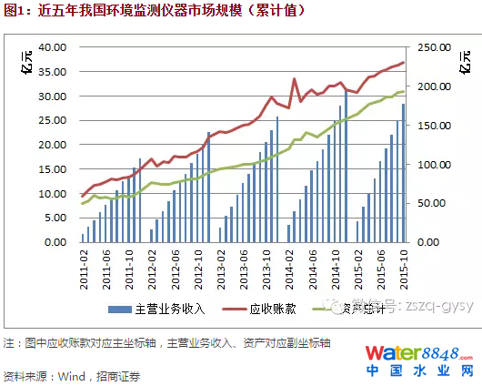 近幾年環(huán)境監(jiān)測(cè)行業(yè)發(fā)展迅速,據(jù)統(tǒng)計(jì),2011-2015年間全國環(huán)境監(jiān)測(cè)儀器行業(yè)資產(chǎn)總值翻了3倍,同時(shí)主營業(yè)務(wù)收入也增長(zhǎng)近2倍(圖1數(shù)據(jù)截止到15年10月)。同時(shí),應(yīng)收賬款總額也伴隨著行業(yè)發(fā)展迅速增加,到15年末也翻了3倍。