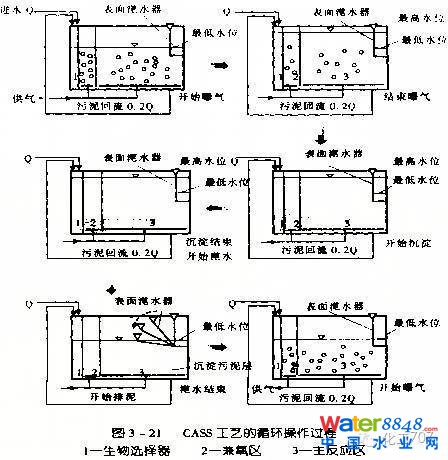CASS工藝集反應(yīng)、沉淀、排水、功能于一體,污染物的降解在時(shí)間上是一個(gè)推流過程,而微生物則處于好氧、缺氧、厭氧周期性變化之中,從而達(dá)到對(duì)污染物去除作用,同時(shí)還具有較好的脫氮、除磷功能。