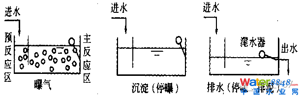 SBR工藝的基本運(yùn)行模式由進(jìn)水、反應(yīng)、沉淀、出水和閑置五個(gè)基本過程組成,從污水流入到閑置結(jié)束構(gòu)成一個(gè)周期,在每個(gè)周期里上述過程都是在一個(gè)設(shè)有曝氣或攪拌裝置的反應(yīng)器內(nèi)依次進(jìn)行的。