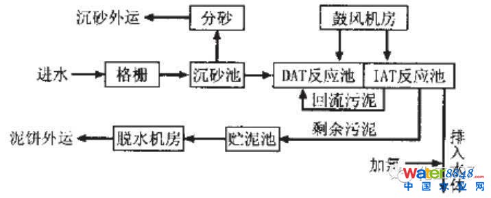 DAT池和IAT池串聯(lián)組成,DAT 連續(xù)進(jìn)水,連續(xù)曝氣(也可間歇曝氣),IAT也是連續(xù)進(jìn)水,但間歇曝氣,清水和剩余活性污泥均由IAT池排出。和典型的SBR 反應(yīng)池一樣,IAT 池運(yùn)行操作由進(jìn)水、反應(yīng)、沉淀、出水和待機(jī)5個(gè)階段組成。