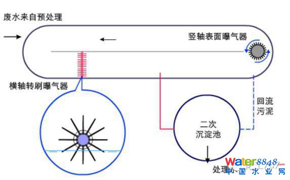 氧化溝是延時(shí)曝氣法的一種特殊形式,它的池體狹長,池深較淺,在溝槽中設(shè)有表面曝氣裝置。