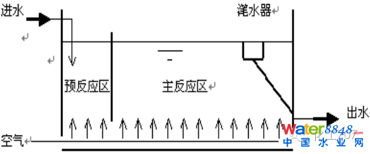反應(yīng)池由兩部分組成,前一部分為預(yù)反應(yīng)區(qū),也稱進(jìn)水曝氣區(qū),后一部分為主反應(yīng)區(qū)。主、預(yù)反應(yīng)區(qū)之間的底部有孔洞相連,污水以很低的流速有預(yù)反應(yīng)區(qū)進(jìn)入主反應(yīng)區(qū)。