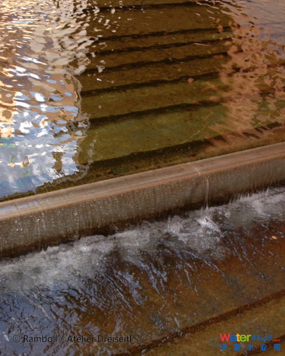 如果需要,也會使用工程過濾手段移除夏季水面上漂浮的藻類。在瑪琳•黛德麗廣場(Marlene-Dietrich-Platz)水體以復雜多變的形式流向廣場的最低點。水體自主體部分向流動階梯滑行,在此處具有韻律感的波形結(jié)構(gòu)被創(chuàng)造出來。細部設計精確至厘米,由全比例的模型制作而成。之后毗鄰廣場,水體從兩側(cè)緩緩移動,穿過線形水階,清晰地與建筑體形態(tài)呼應。最終,水流從北部水體出發(fā),流入一個狹窄的水渠。該項目被設置了極其復雜的設計標準,戴姆勒克萊斯勒集團(DaimlerChrysler)的代表卡爾海因茨•博恩(Karlheinz Bohn)在波茨坦廣場開放之后恰當?shù)刂赋隽?ldquo;正如這一設計概念帶給我們所有人迷人的景致,我們也能夠非常清楚地看到如果建造人工的大水面,則需要高能耗的技術(shù)干預和化學添加物的使用。”這一設計的結(jié)果能夠成為一個很好的說服,因它的實施,水質(zhì)保持很好,對于降雨也具備一定的緩沖能力,同時能夠節(jié)約建筑物內(nèi)部的凈水消耗量。用設計語言來講,這一處具有城市水敏特征的設計賦予了波茨坦廣場開放空間獨特的魅力!