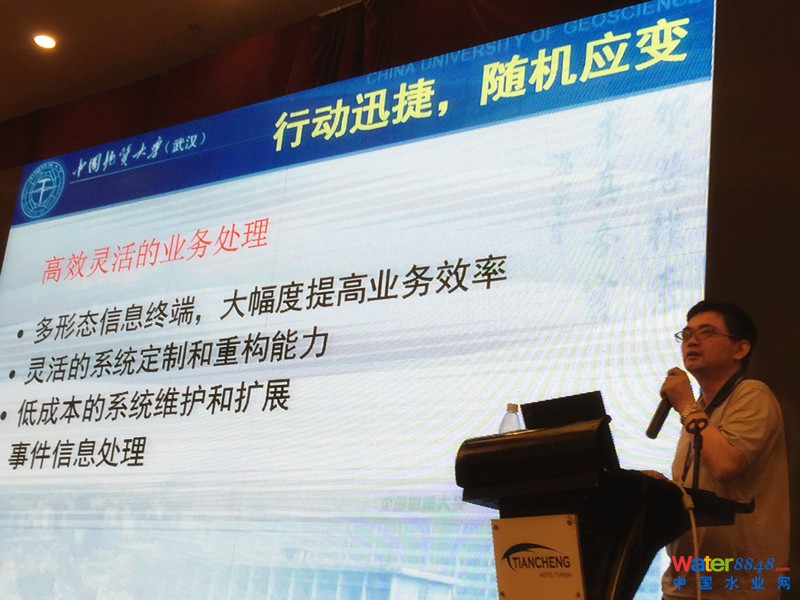 報(bào)告強(qiáng)調(diào)了智慧水務(wù)建設(shè)的核心理念:一、以長治久安為目標(biāo),設(shè)計(jì)建立開放式可擴(kuò)展架構(gòu);二、以GIS 為基礎(chǔ),實(shí)現(xiàn)數(shù)據(jù)融合和全局可視;三、以數(shù)據(jù)為核心,用管理機(jī)制和技術(shù)手段維護(hù)數(shù)據(jù)的準(zhǔn)確性、現(xiàn)勢性和完整性;四、以業(yè)務(wù)協(xié)同、流程優(yōu)化為抓手,迅速見效,滾動(dòng)發(fā)展;五、以移動(dòng)互聯(lián)為突破,實(shí)現(xiàn)信息的通暢流轉(zhuǎn)和便捷利用。該報(bào)告以“常熟中法水務(wù)智慧水務(wù)系統(tǒng)”為例,講述了“以GIS為基礎(chǔ)的智慧水務(wù)解決方案”如何實(shí)現(xiàn)水司供水管網(wǎng)智慧運(yùn)作和科學(xué)管理。曾文教授的精彩報(bào)告贏得了全場的熱烈掌聲,獲得了廣泛的肯定。