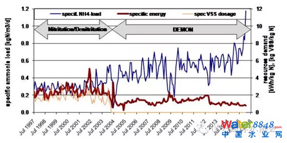 從上圖可以看出,自2004年Strass污水廠引入側流DEMON技術后,無需再外加碳源即可進行脫氮,脫氮的能耗也隨之降低近一半。自2016年初工廠還采用了最新的分離富集設備代替原先的旋流分離器,側流系統(tǒng)的氨氮負荷可提高至1.0KgN/m3/d以上,并穩(wěn)定運行。