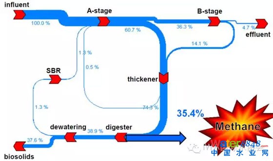 采用傳統(tǒng)AB處理工藝的奧地利Strass污水廠,因在能源自給方面取得的成功而名聲大噪。早在20世紀90年代,Strass污水廠就開始關注如何能在滿足工廠運行之外實現(xiàn)產(chǎn)能。其合理性在于污水中蘊含的能量遠高于處理污水所需的能耗。典型的歐洲污水按人口當量計算,理論上污水中蘊含的能量為18W/person,而處理污水的能耗約為5-7W/person。