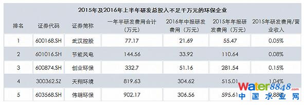 研發(fā)費用投入不足的環(huán)保企業(yè)也有不少,有15家企業(yè)2015年研發(fā)費用投入占營業(yè)收入比例不足2%。其中,有5家上市公司2015年至2016年上半年研發(fā)費用合計投入不超過1000萬元,這5家公司投入占比也是極低。