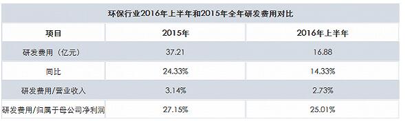 第二,較2015年全年相比,環(huán)保行業(yè)在2016年上半年的投入有所縮水,具體體現(xiàn)在研發(fā)營收占比及研發(fā)費用增速上。