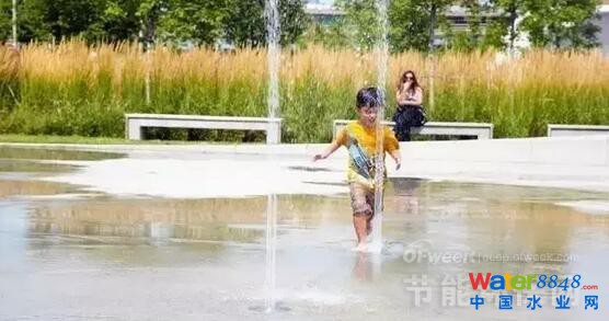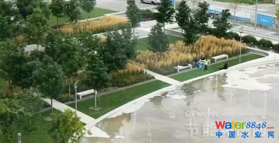 該公園的地下修建了雨污蓄滯沉積凈化設(shè)施。地面徑流由排水管網(wǎng)收集后排入地下沉積設(shè)施,進(jìn)行固體懸浮質(zhì)沉淀。澄清的水輸送到設(shè)置于一座公共亭臺地下室的紫外線水處理設(shè)施。