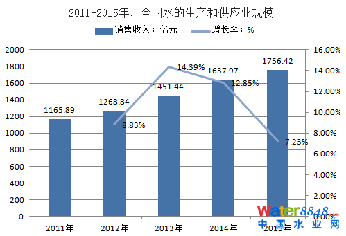 2015年,我國(guó)水務(wù)行業(yè)規(guī)模以上企業(yè)資產(chǎn)總額達(dá)9807.78億元;水的生產(chǎn)和供應(yīng)業(yè)企業(yè)銷售收入1756.42億元,同比增長(zhǎng)了7.23%,自來(lái)水的生產(chǎn)和供應(yīng)行業(yè)共計(jì)實(shí)現(xiàn)銷售收入為1323.39億元,同比增長(zhǎng)8.26%。
