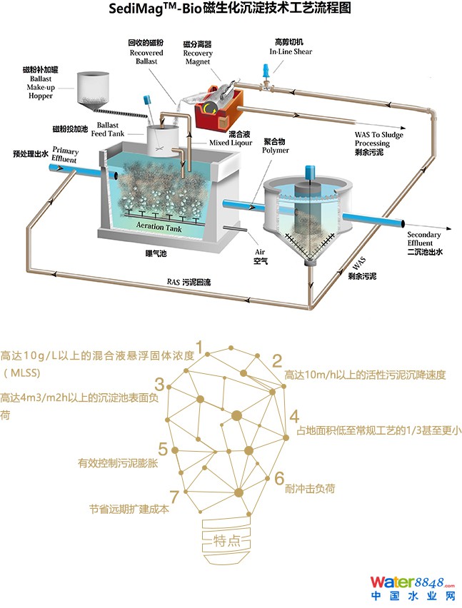 磁生化沉淀技術是是通過在活性污泥生化處理工藝中投入高效可回收的磁粉,以提高混合液污泥濃度和加速污泥沉降速度來優(yōu)化和提升處理效果的技術。