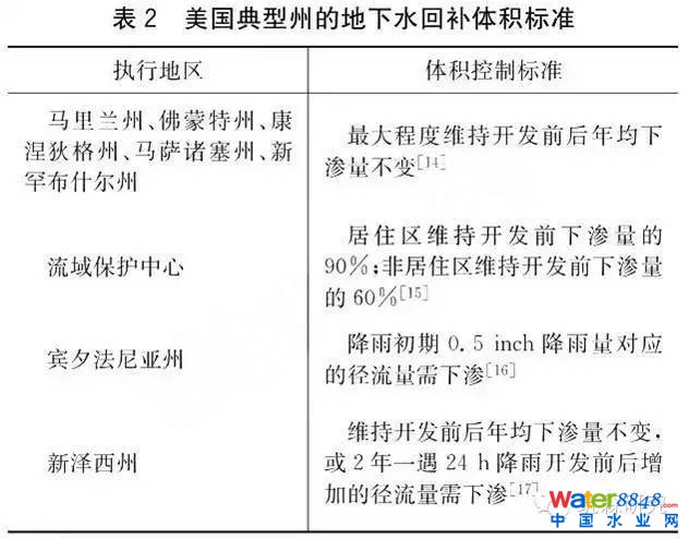 地下水回補體積(GroundwaterRecharge Volume, GRV)是水質(zhì)控制體積中的一部分,有些州明確要求場地內(nèi)的雨水進行地下水回補。GRV標準的制定目的在于通過生物滯留、透水鋪裝、滲透塘等雨水下滲技術(shù)維持地下水水位及基流量,防止河道與濕地萎縮。GRv的制定基于LID理念,即綜合考慮具體場地的土壤類型、氣候特點等因素,最大程度維持開發(fā)前自然下滲量。美國部分州GRV標準如表2所示。