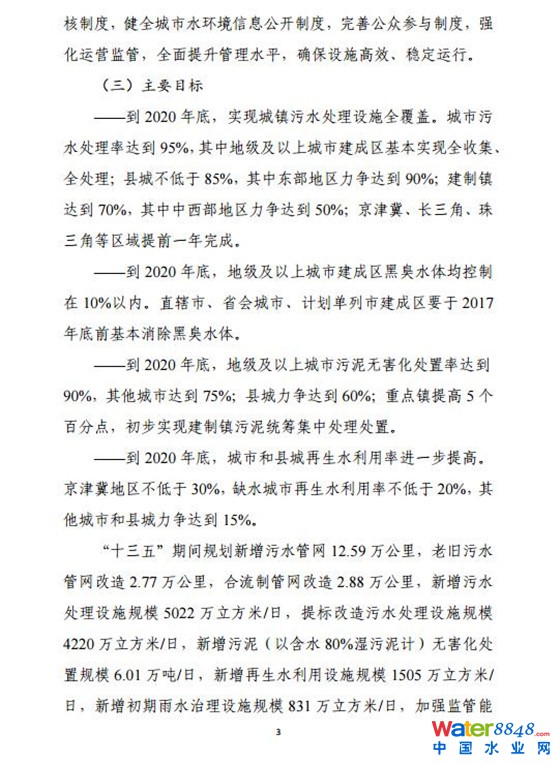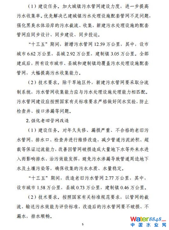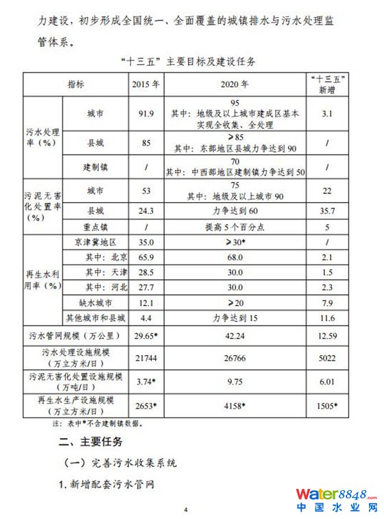 2 相關(guān)要求,牢固樹立“創(chuàng)新、協(xié)調(diào)、綠色、開放、共享”的發(fā)展理念,尊重并順應(yīng)城鎮(zhèn)發(fā)展規(guī)律,嚴(yán)格遵循“節(jié)水優(yōu)先、空間均衡、系統(tǒng)治理、兩手發(fā)力”的治水方針,以改善水環(huán)境質(zhì)量為核心,倒逼城鎮(zhèn)污水處理設(shè)施建設(shè)和升級(jí)改造,統(tǒng)籌規(guī)劃、科學(xué)引導(dǎo),加快形成“綠色生態(tài)、系統(tǒng)協(xié)調(diào)”的城鎮(zhèn)污水處理及再生利用設(shè)施建設(shè)格局。(二)基本原則尊重自然,統(tǒng)籌規(guī)劃。全面落實(shí)生態(tài)文明理念,將污水處理作為改善城鎮(zhèn)水生態(tài)環(huán)境的關(guān)鍵環(huán)節(jié),堅(jiān)持城鎮(zhèn)污水處理設(shè)施建設(shè)與經(jīng)濟(jì)社會(huì)發(fā)展水平相協(xié)調(diào),與城鎮(zhèn)發(fā)展總體規(guī)劃相銜接,與環(huán)境改善需求相適應(yīng)。系統(tǒng)協(xié)調(diào),提質(zhì)增效。按照經(jīng)濟(jì)適用、節(jié)約資源、高效有序的要求,科學(xué)規(guī)劃城鎮(zhèn)污水處理設(shè)施建設(shè),提高設(shè)施運(yùn)行效率,有效改善水環(huán)境質(zhì)量。加快城鎮(zhèn)污水處理設(shè)施和管網(wǎng)建設(shè)改造,廠網(wǎng)配套、泥水并重,提高污水收集能力,推進(jìn)污泥無害化處置。問題導(dǎo)向,突出重點(diǎn)。以修復(fù)城市水生態(tài)環(huán)境、整治城市黑臭水體、緩解水資源緊缺等突出問題為導(dǎo)向,重點(diǎn)優(yōu)化污水收集與處理設(shè)施的空間布局,提高城鎮(zhèn)污水處理及再生利用水平,加快推進(jìn)污水管網(wǎng)改造、排水口及檢查井滲漏治理,開展城市建成區(qū)初期雨水污染治理。政府主導(dǎo),加強(qiáng)監(jiān)管。堅(jiān)持政府主導(dǎo),明確責(zé)任主體,加大資金投入,加強(qiáng)政府與社會(huì)資本合作。健全有效的監(jiān)管和績(jī)效考 3 核制度,健全城市水環(huán)境信息公開制度,完善公眾參與制度,強(qiáng)化運(yùn)營(yíng)監(jiān)管,全面提升管理水平,確保設(shè)施高效、穩(wěn)定運(yùn)行。(三)主要目標(biāo) ——到 2020 年底,實(shí)現(xiàn)城鎮(zhèn)污水處理設(shè)施全覆蓋。城市污水處理率達(dá)到 95%,其中地級(jí)及以上城市建成區(qū)基本實(shí)現(xiàn)全收集、全處理;縣城不低于 85%,其中東部地區(qū)力爭(zhēng)達(dá)到 90%;建制鎮(zhèn)達(dá)到 70%,其中中西部地區(qū)力爭(zhēng)達(dá)到 50%;京津冀、長(zhǎng)三角、珠三角等區(qū)域提前一年完成。 ——到 2020 年底,地級(jí)及以上城市建成區(qū)黑臭水體均控制在 10%以內(nèi)。直轄市、省會(huì)城市、計(jì)劃單列市建成區(qū)要于 2017 年底前基本消除黑臭水體。 ——到 2020 年底,地級(jí)及以上城市污泥無害化處置率達(dá)到 90%,其他城市達(dá)到 75%;縣城力爭(zhēng)達(dá)到 60%;重點(diǎn)鎮(zhèn)提高 5 個(gè)百分點(diǎn),初步實(shí)現(xiàn)建制鎮(zhèn)污泥統(tǒng)籌集中處理處置。 ——到 2020 年底,城市和縣城再生水利用率進(jìn)一步提高。京津冀地區(qū)不低于 30%,缺水城市再生水利用率不低于 20%,其他城市和縣城力爭(zhēng)達(dá)到 15%。 “十三五”期間規(guī)劃新增污水管網(wǎng) 12.59 萬公里,老舊污水管網(wǎng)改造 2.77 萬公里,合流制管網(wǎng)改造 2.88 萬公里,新增污水處理設(shè)施規(guī)模 5022 萬立方米/日,提標(biāo)改造污水處理設(shè)施規(guī)模 4220 萬立方米/日,新增污泥(以含水 80%濕污泥計(jì))無害化處置規(guī)模 6.01 萬噸/日,新增再生水利用設(shè)施規(guī)模 1505 萬立方米/ 日,新增初期雨水治理設(shè)施規(guī)模 831 萬立方米/日,加強(qiáng)監(jiān)管能 4 力建設(shè),初步形成全國(guó)統(tǒng)一、全面覆蓋的城鎮(zhèn)排水與污水處理監(jiān)管體系。 “十三五”主要目標(biāo)及建設(shè)任務(wù)指標(biāo) 2015 年 2020 年 “十三五” 新增污水處理率(%)城市 91.9 95 其中:地級(jí)及以上城市建成區(qū)基本實(shí)現(xiàn)全收集、全處理 3.1 縣城 85 ≥85 其中:東部地區(qū)縣城力爭(zhēng)達(dá)到 90 / 建制鎮(zhèn) / 70 其中:中西部地區(qū)建制鎮(zhèn)力爭(zhēng)達(dá)到 50 / 污泥無害化處置率(%)城市 53 75 其中:地級(jí)及以上城市 90 22 縣城 24.3 力爭(zhēng)達(dá)到 60 35.7 重點(diǎn)鎮(zhèn) / 提高 5 個(gè)百分點(diǎn) 5 再生水利用率(%)京津冀地區(qū) 35.0 ≥30* / 其中:北京 65.9 68.0 2.1 其中:天津 28.5 30.0 1.5 其中:河北 27.7 30.0 2.3 缺水城市 12.1 ≥20 7.9 其他城市和縣城 4.4 力爭(zhēng)達(dá)到 15 11.6 污水管網(wǎng)規(guī)模(萬公里) 29.65* 42.24 12.59 污水處理設(shè)施規(guī)模(萬立方米/日) 21744 26766 5022 污泥無害化處置設(shè)施規(guī)模(萬噸/日) 3.74* 9.75 6.01 再生水生產(chǎn)設(shè)施規(guī)模(萬立方米/日) 2653* 4158* 1505* 注:表中*不含建制鎮(zhèn)數(shù)據(jù)。 二、主要任務(wù)(一)完善污水收集系統(tǒng) 1.新增配套污水管網(wǎng) 5 (1)建設(shè)任務(wù)。加大城鎮(zhèn)污水管網(wǎng)建設(shè)力度,進(jìn)一步提高污水收集率。優(yōu)先解決已建城鎮(zhèn)污水處理設(shè)施配套管網(wǎng)不足問題,強(qiáng)化黑臭水體沿岸的污水截流、收集,新建污水處理設(shè)施的配套管網(wǎng)應(yīng)同步設(shè)計(jì)、同步建設(shè)、同步投運(yùn)。 “十三五”期間,新