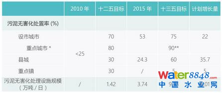 提出了非?捎^的增長目標。(見表二)在污泥無害化處置率方面,即使增長率最小的設市城市的無害化處置率,增長幅度也接近41%,縣城以及重點鎮(zhèn)的增長幅度更是高達147%以及100%。