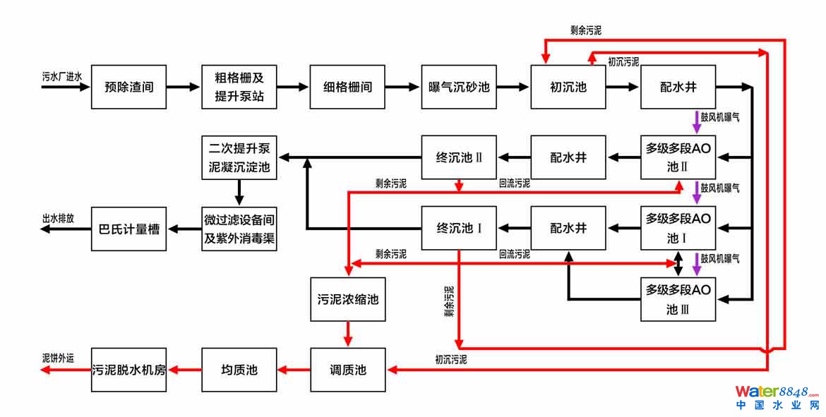 該廠于1956年開(kāi)始建設(shè),1958年建成投入運(yùn)行,1963年、1976年、1999年先后進(jìn)行過(guò)三次改擴(kuò)建。2014年由中國(guó)市政工程西北設(shè)計(jì)研究院有限公司和中鐵一局集團(tuán)聯(lián)合EPC總承包,進(jìn)行第四次擴(kuò)建改造,處理能力12×104m3/d,處理深度為三級(jí)處理。污水處理采用“多段多級(jí)AO+絮凝沉淀+微過(guò)濾”工藝,污泥處理采用“重力濃縮+機(jī)械脫水”工藝,除臭處理采用“CYYF 全過(guò)程除臭”工藝。污水經(jīng)進(jìn)水分流井、預(yù)除渣間到粗格柵進(jìn)入提升泵房,由單管出水井到細(xì)格柵、曝氣沉砂池,經(jīng)初次沉淀池后,進(jìn)入多級(jí)多段AO工藝處理,終沉池出水經(jīng)二次提升泵房二次提升后,經(jīng)混凝沉淀池、微過(guò)濾設(shè)備間、次氯酸鈉輔助紫外消毒渠深度處理后,排放至皂河。CYYF 全過(guò)程除臭將含有組合生物填料的培養(yǎng)箱安裝于污水處理廠生物池內(nèi),實(shí)現(xiàn)污水廠惡臭的全過(guò)程控制。剩余活性污泥經(jīng)重力濃縮后,進(jìn)行機(jī)械脫水。