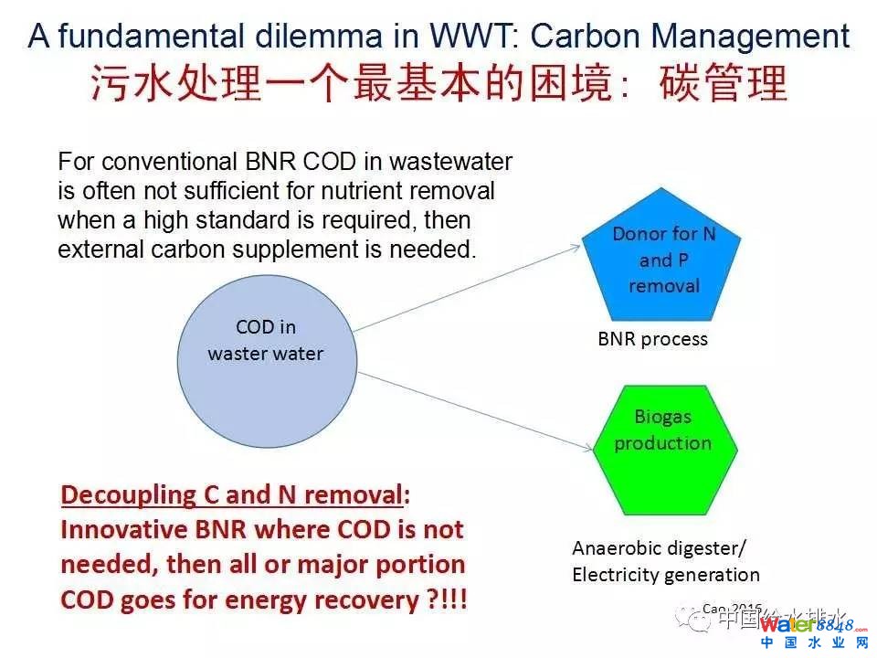 2025年新加坡三個水廠建成的時候,能量回收的情況如何呢?污水處理最大的困境就是碳的管理,本身讓碳源要用來去除營養(yǎng)物又產能源的時候,是很難兩全其美的,這就是我們現(xiàn)在要談主流厭氧氨氧化的問題。未來處理廠的概念,如果這概念廠能實現(xiàn),今后的處理廠可可以把盡量多的碳拿下來送到厭氧消化里面去產生能源。但是條件是什么呢?后面的營養(yǎng)物的去除不需要碳源,或者是需要的很少,這就提供了一種能源平衡和剩余的可能性。比如說我們先的現(xiàn)在的初沉池碳去除是40%,你就可以增長到60%,相當于50%能源的增加。